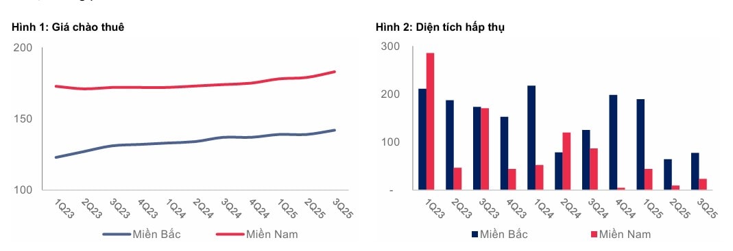 Theo CBRE, giá chào thuê tăng khoảng 2% so với quý trước và 4% so với cùng kỳ năm trước. Diện tích hấp thụ đã tăng trở lại so với quý trước cho thấy dấu hiệu phục hồi nhưng vẫn giảm so với cùng kỳ trên cả hai thị trường phía Bắc và phía Nam.
