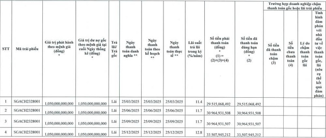 Cụ thể, trong năm 2025, Bất động sản Sài Gòn Anpha đã thanh toán đúng hạn 4 kỳ lãi cho lô trái phiếu mã SGACH2328001 với tổng giá trị gần 125 tỷ đồng.