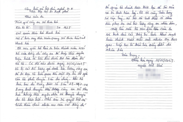 Bà Vũ Thị K gửi thư cảm ơn Công an xã Thiệu Hoá