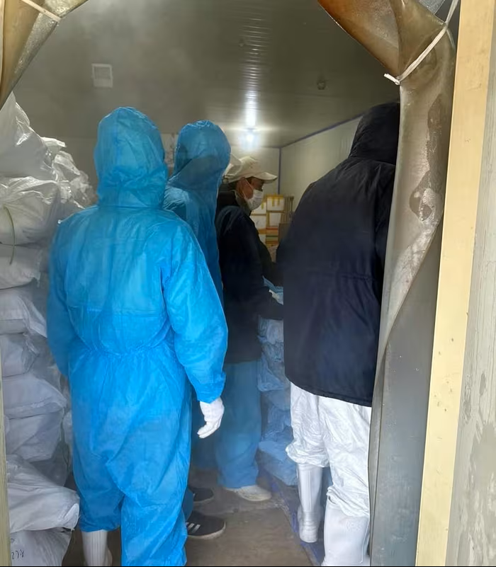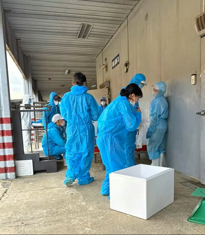 Lực lượng chức năng lấy mẫu kiểm định thịt lợn trong kho lạnh Công ty CP đồ hộp Hạ Long.