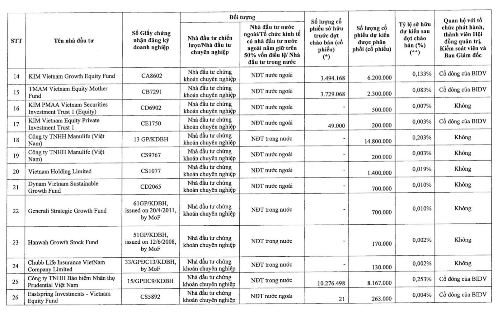 Cụ thể, BIDV dự kiến chào bán 264,07 triệu cổ phiếu phổ thông theo hình thức phát hành riêng lẻ. Thời gian thực hiện dự kiến trong quý I. Cổ phiếu chào bán riêng lẻ sẽ bị hạn chế chuyển nhượng 1 năm.
