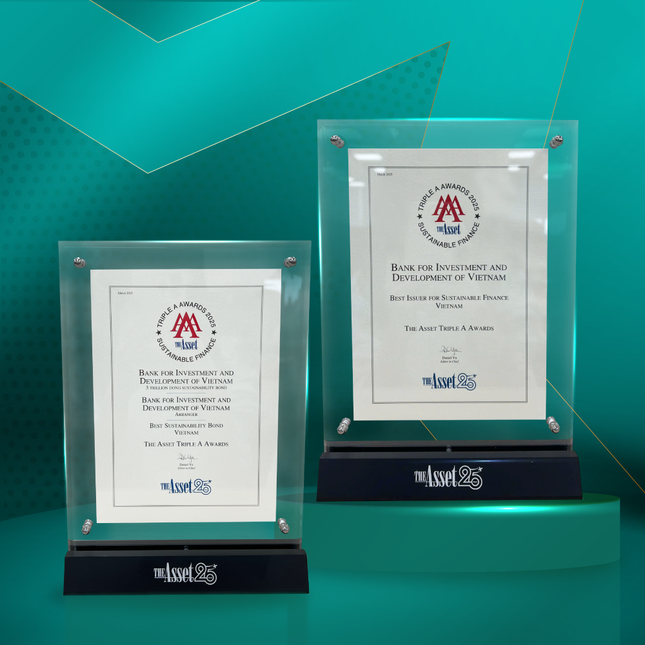 Vừa qua, Ngân hàng TMCP Đầu tư và Phát triển Việt Nam (BIDV) đã được Tạp chí The Asset (HongKong) vinh danh với 02 giải thưởng:“Best Issuer for Sustainable Finance in Vietnam 2025” (Tổ chức phát hành bền vững xuất sắc nhất Việt Nam năm 2025) và “Best Sustainable Bond in Vietnam 2025” (Giao dịch trái phiếu bền vững xuất sắc nhất Việt Nam năm 2025).