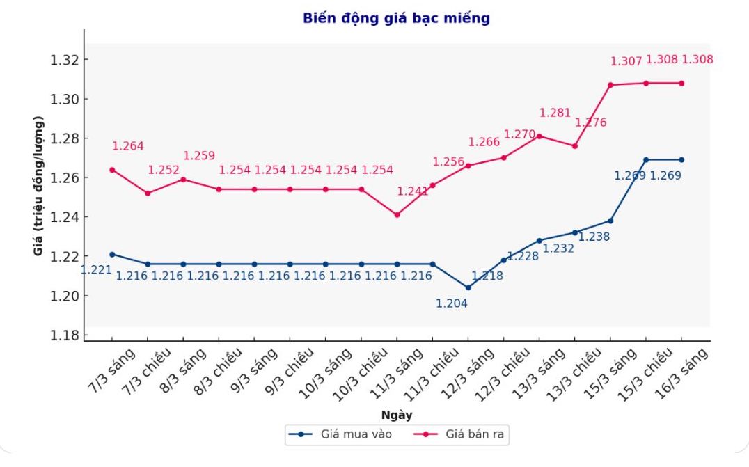 Tính đến 9h30 ngày 16.3, giá bạc miếng 999 tại Tập đoàn Vàng bạc Đá quý Phú Quý niêm yết ở ngưỡng 1,269 - 1,308 triệu đồng/lượng (mua vào - bán ra); giữ nguyên ở cả hai chiều mua vào và bán ra so với đầu giờ sáng qua.