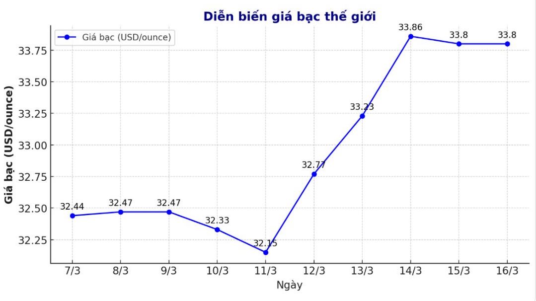 Trên thị trường thế giới, tính đến 9h45 ngày 16.3 (theo giờ Việt Nam), giá bạc thế giới niêm yết trên Goldprice.org ở ngưỡng 33,80 USD/ounce; giữ nguyên so với cùng thời điểm phiên giao dịch trước.