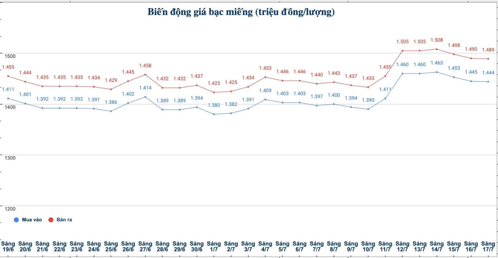 Tính đến 11h25 ngày 17.7, giá bạc miếng 999 tại Tập đoàn Vàng bạc Đá quý Phú Quý niêm yết ở ngưỡng 1,444 - 1,489 triệu đồng/lượng (mua vào - bán ra); giảm 1.000 đồng/lượng ở cả hai chiều mua vào - bán ra so với sáng qua.