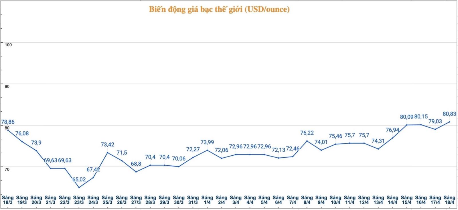 Trên thị trường thế giới, tính đến 9h10 ngày 18.4 (theo giờ Việt Nam), giá bạc thế giới niêm yết ở ngưỡng 80,83 USD/ounce; tăng 1,8 USD so với sáng qua.