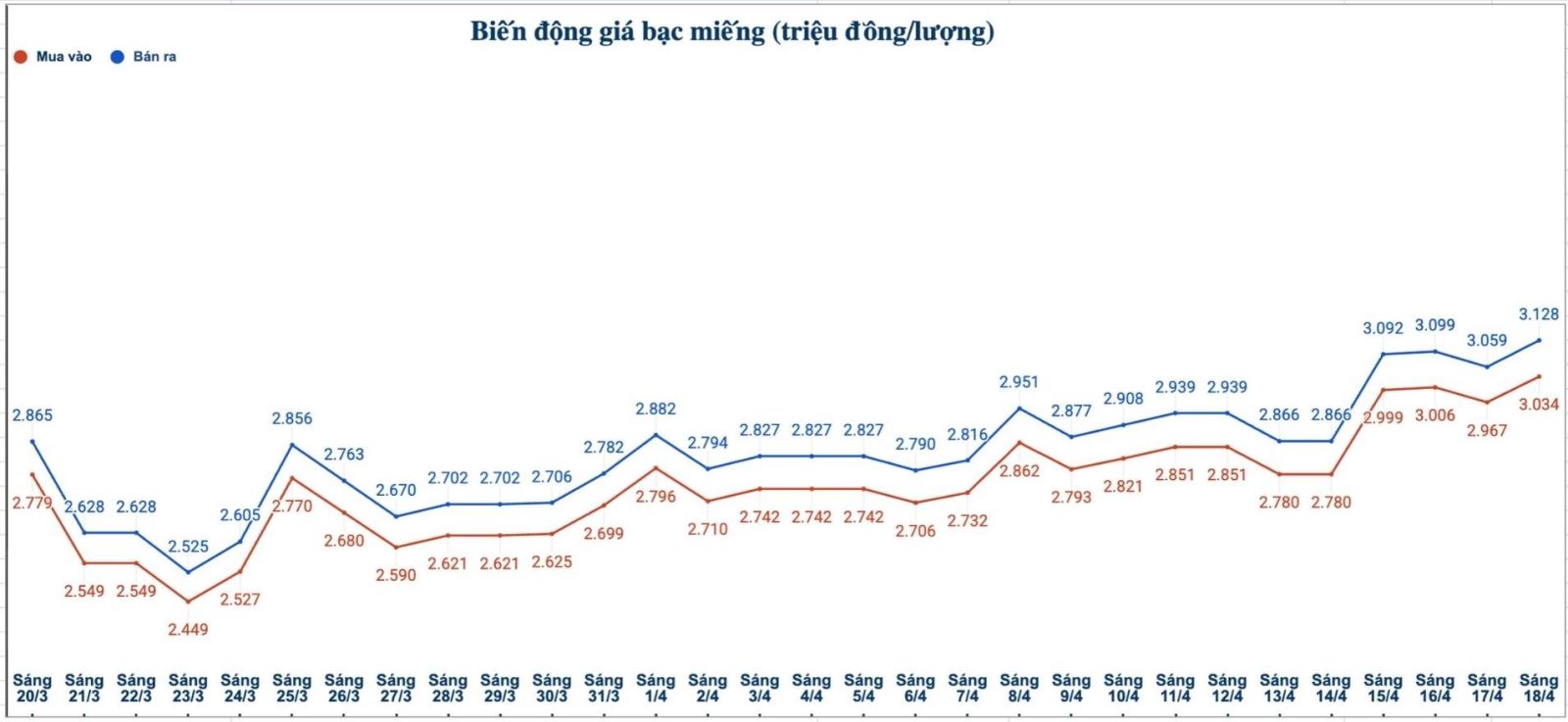 Tính đến 9h10 ngày 18.4, giá bạc miếng Kim Phúc Lộc 999 (1 lượng) của Công ty TNHH Một thành viên Vàng Bạc Đá Quý Ngân hàng Sài Gòn Thương Tín (Sacombank-SBJ) niêm yết ở ngưỡng 2,982 - 3,072 triệu đồng/lượng (mua vào - bán ra); tăng 39.000 đồng/lượng ở cả hai chiều so với sáng qua.