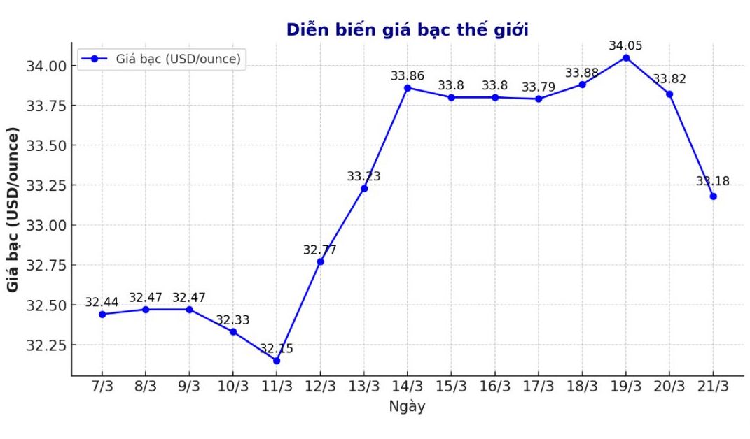 Trên thị trường thế giới, tính đến 11h45 ngày 21.3 (theo giờ Việt Nam), giá bạc thế giới niêm yết trên Goldprice.org ở ngưỡng 33,18 USD/ounce; giảm 0,84% so với phiên giao dịch trước.