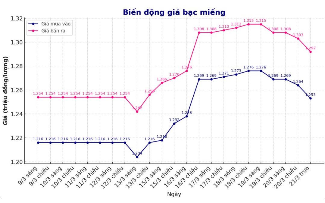 Tính đến 11h30 ngày 21.3, giá bạc miếng 999 tại Tập đoàn Vàng bạc Đá quý Phú Quý niêm yết ở ngưỡng 1.253 - 1.292 triệu đồng/lượng (mua vào - bán ra); giảm 16.000 đồng/lượng ở cả hai chiều mua vào và bán ra so với đầu giờ sáng qua.