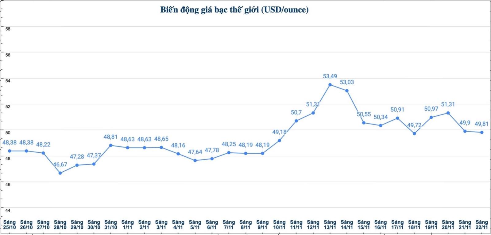Trên thị trường thế giới, tính đến 11h15 ngày 22.11 (theo giờ Việt Nam), giá bạc thế giới niêm yết ở ngưỡng 49,81 USD/ounce; giảm 0,09 USD so với sáng qua.