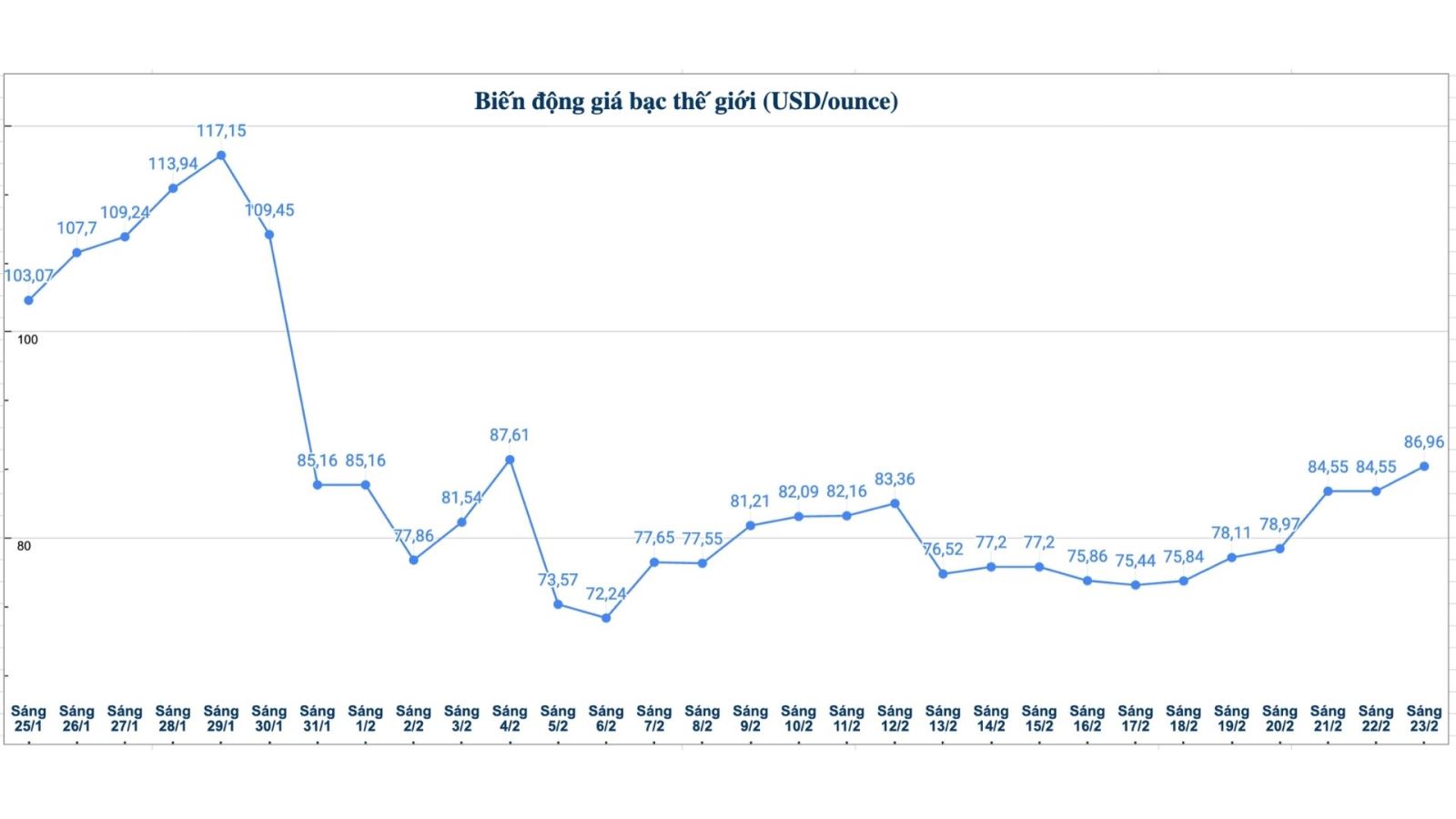 Trên thị trường thế giới, tính đến 13h10 ngày 23.2 (theo giờ Việt Nam), giá bạc thế giới niêm yết ở ngưỡng 86,96 USD/ounce; tăng 2,41 USD so với sáng qua