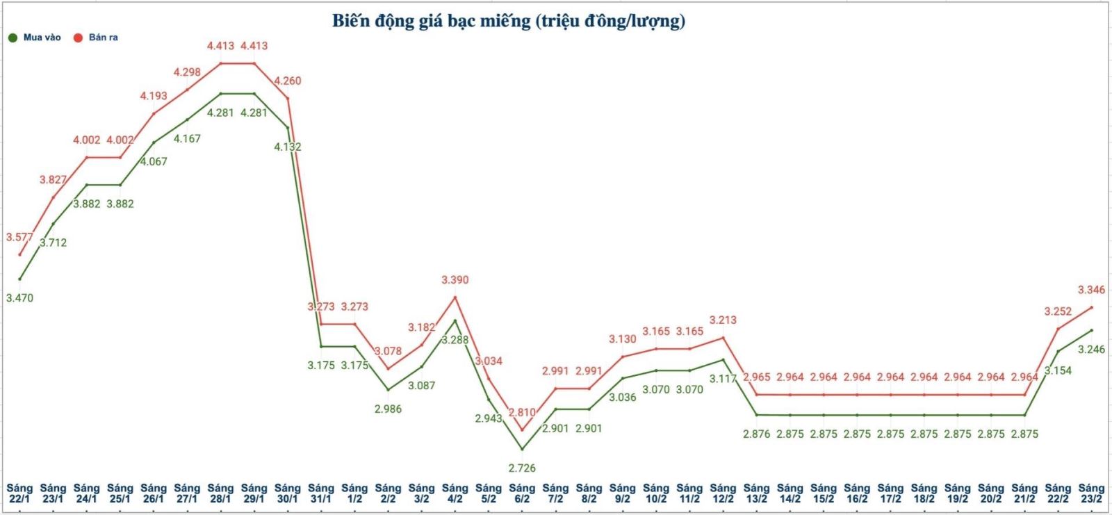 Biến động giá bạc trong nước những phiên gần đây. Biểu đồ: Phương Anh