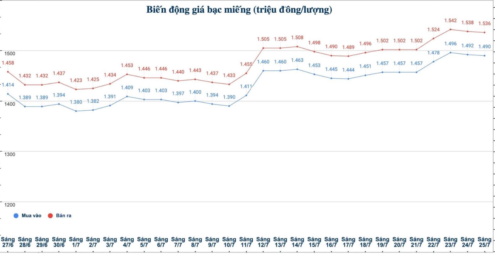 Tính đến 9h45 ngày 25.7, giá bạc miếng 999 tại Tập đoàn Vàng bạc Đá quý Phú Quý niêm yết ở ngưỡng 1,490 - 1,536 triệu đồng/lượng (mua vào - bán ra); giảm 2.000 đồng/lượng ở cả hai chiều mua vào và bán ra so với sáng qua.
