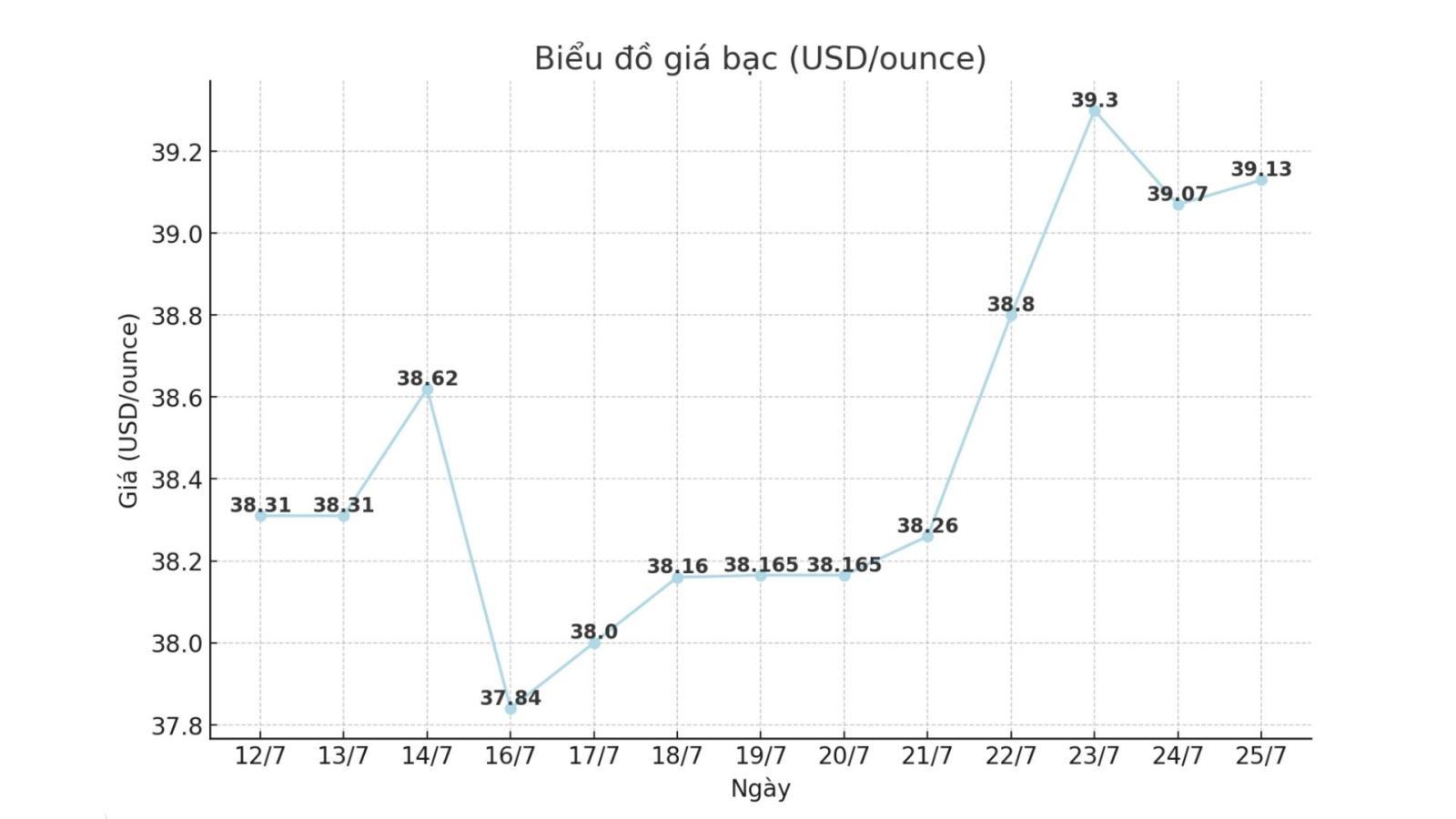 Trên thị trường thế giới, tính đến 9h45 ngày 25.7 (theo giờ Việt Nam), giá bạc thế giới niêm yết ở ngưỡng 39,13 USD/ounce; tăng 0,06 USD so với sáng qua.