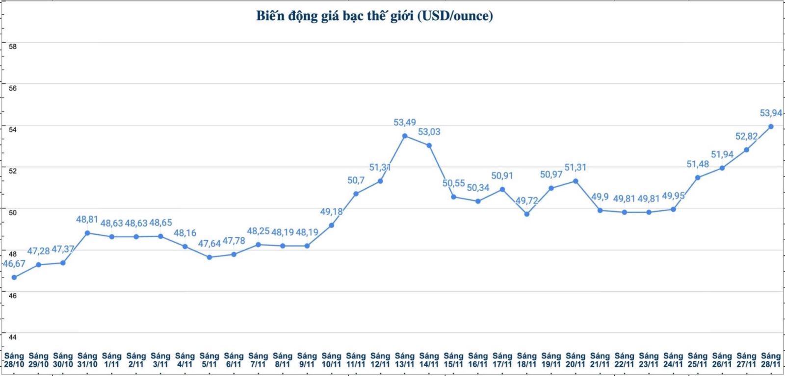 Trên thị trường thế giới, tính đến 9h25 ngày 28.11 (theo giờ Việt Nam), giá bạc thế giới niêm yết ở ngưỡng 53,94 USD/ounce; tăng 1,12 USD so với sáng qua.