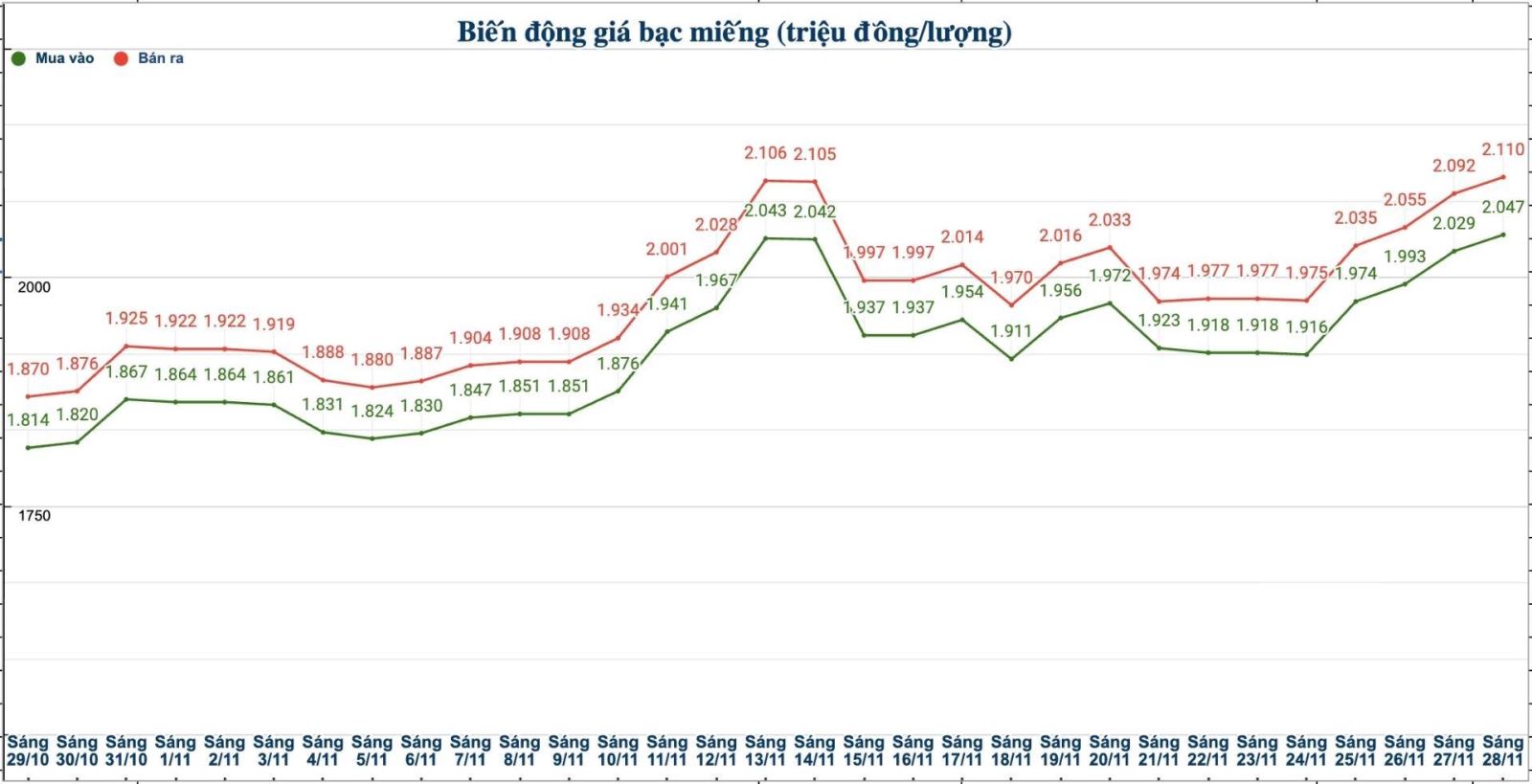 Diễn biến giá bạc trong nước những phiên gần đây. Biểu đồ: Phương Anh