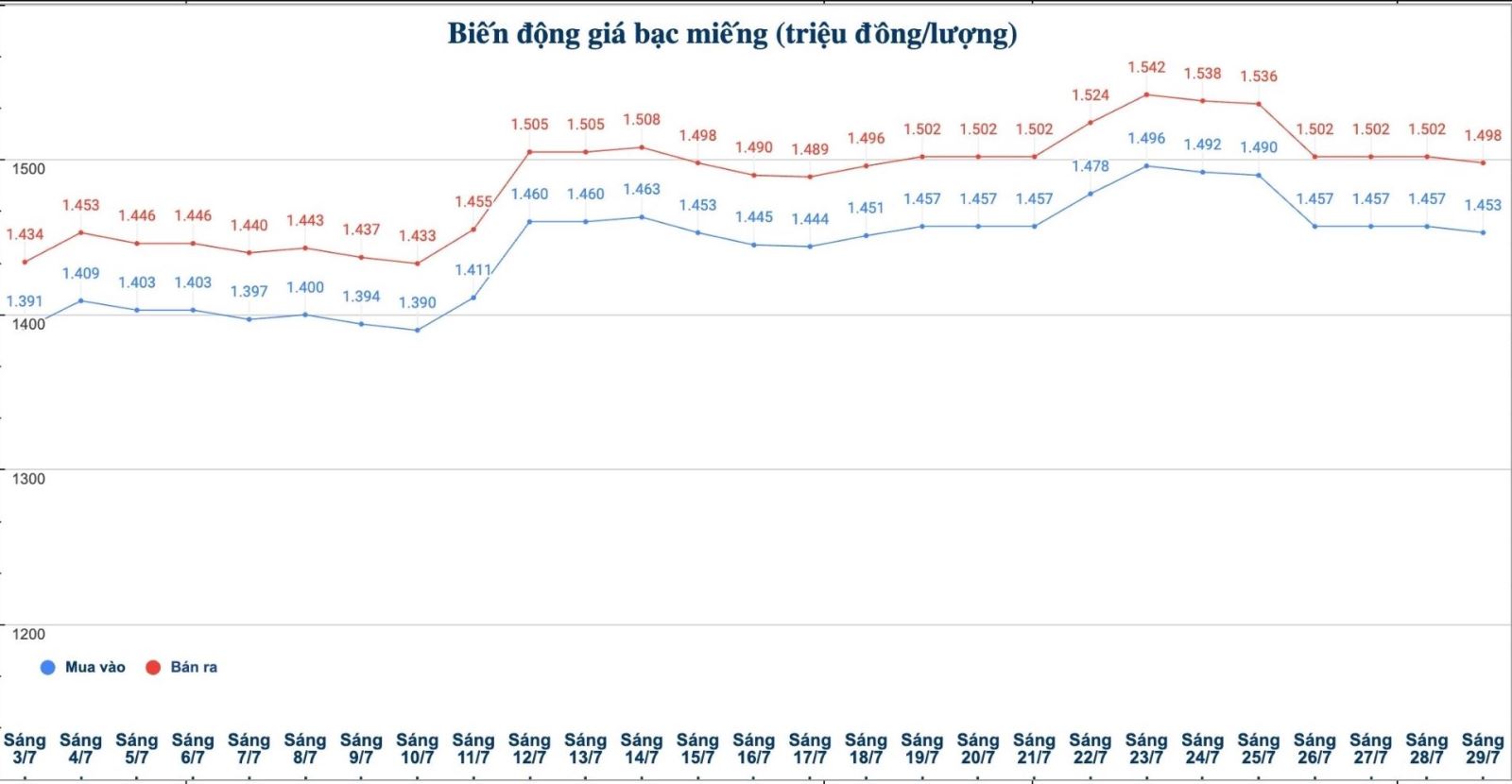 Tính đến 9h45 ngày 29.7, giá bạc miếng 999 tại Tập đoàn Vàng bạc Đá quý Phú Quý niêm yết ở ngưỡng 1,453 - 1,498 triệu đồng/lượng (mua vào - bán ra); giảm 4.000 đồng/lượng ở cả hai chiều mua vào - bán ra so với sáng qua.