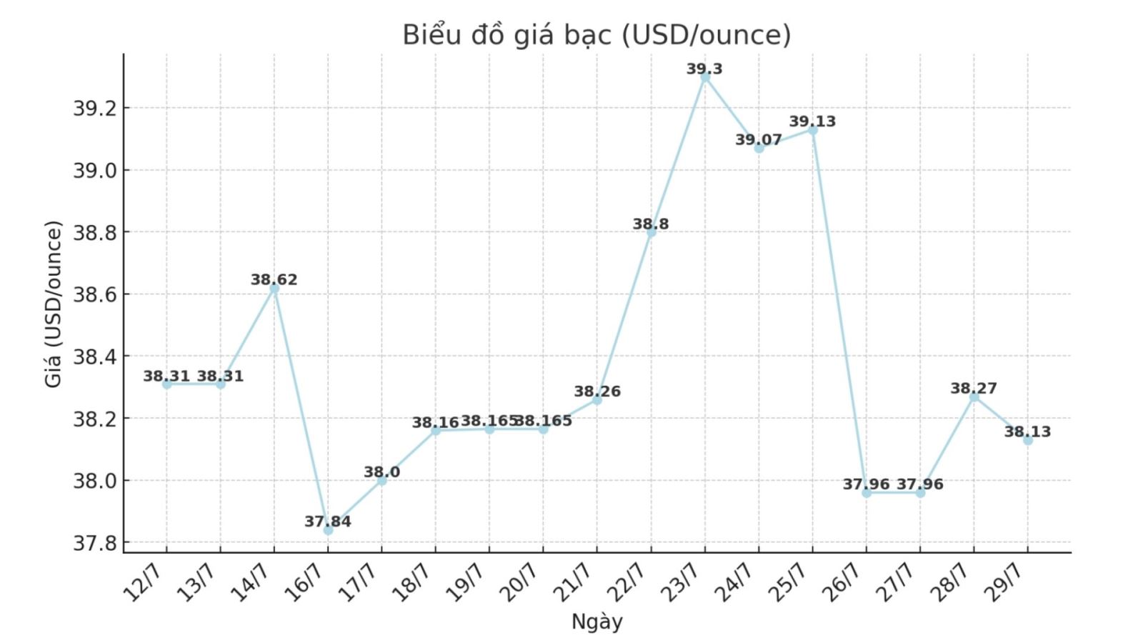 Trên thị trường thế giới, tính đến 9h45 ngày 29.7 (theo giờ Việt Nam), giá bạc thế giới niêm yết ở ngưỡng 38,27 USD/ounce; giảm 0,14 USD so với sáng qua.