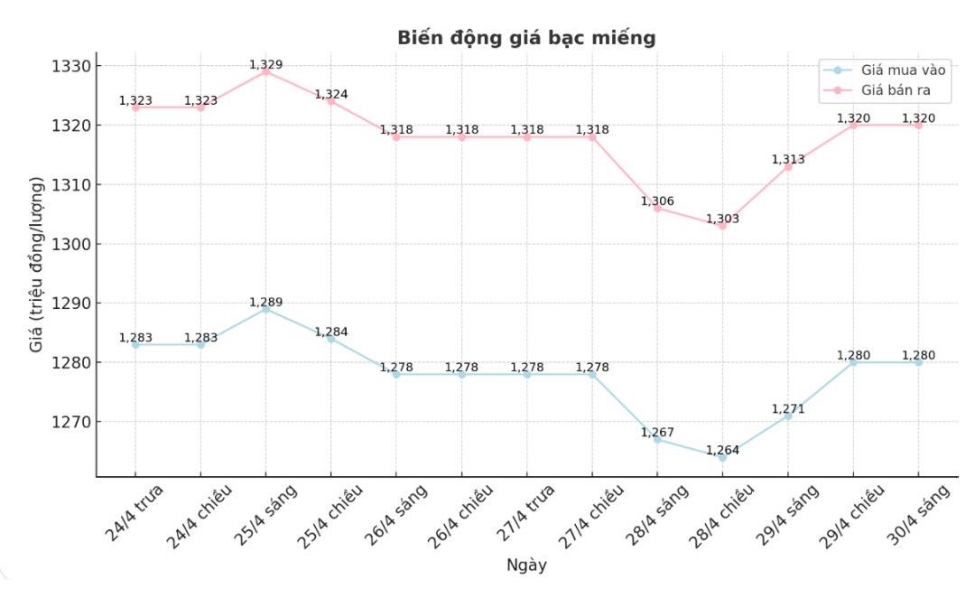 Tính đến 8h00 ngày 30.4, giá bạc miếng 999 tại Tập đoàn Vàng bạc Đá quý Phú Quý niêm yết ở ngưỡng 1,280 - 1,320 triệu đồng/lượng (mua vào - bán ra); tăng 6.000 đồng/lượng ở chiều mua vào và tăng 7.000 đồng/lượng ở chiều bán ra so với đầu giờ sáng qua.