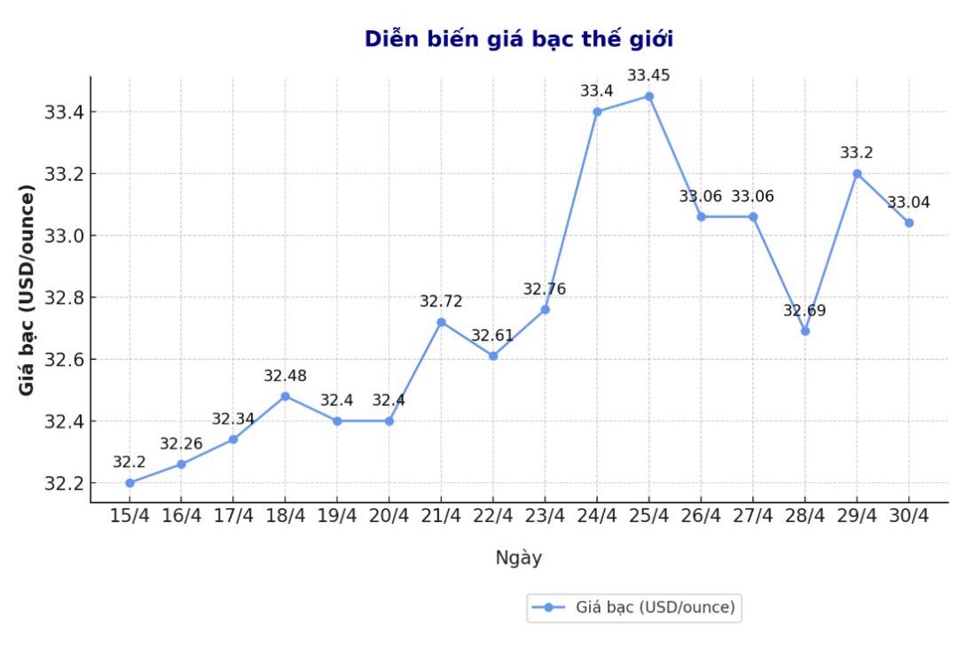 Trên thị trường thế giới, tính đến 8h02 ngày 30.4 (theo giờ Việt Nam), giá bạc thế giới niêm yết trên Goldprice.org ở ngưỡng 33,04 USD/ounce.