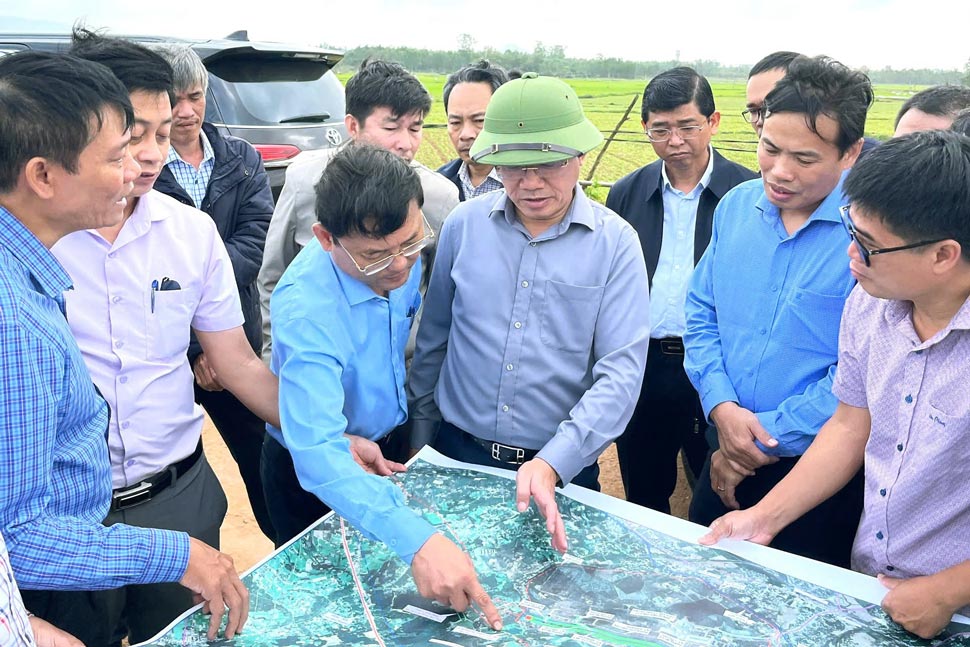 Chủ tịch UBND tỉnh Bình Định (mũ xanh) kiểm tra hiện trường dự án Nâng cấp, mở rộng Cảng hàng không Phù Cát. Ảnh: Thanh Thanh