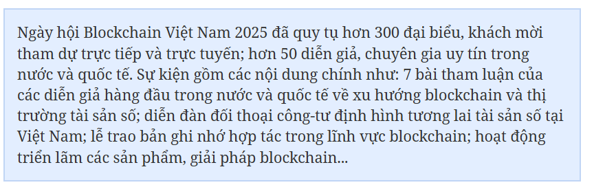 Ngày hội Blockchain Việt Nam 2025 tại Đà Nẵng đã thu hút hàng trăm chuyên gia, nhà quản lý và doanh nghiệp công nghệ cùng bàn về hành trình mới của tài sản số. Những đề xuất triển khai sandbox, hóa đơn điện tử trên nền tảng blockchain hay các giải pháp định danh số cho thấy quyết tâm đưa Việt Nam trở thành điểm đến tiên phong trong kỷ nguyên blockchain.