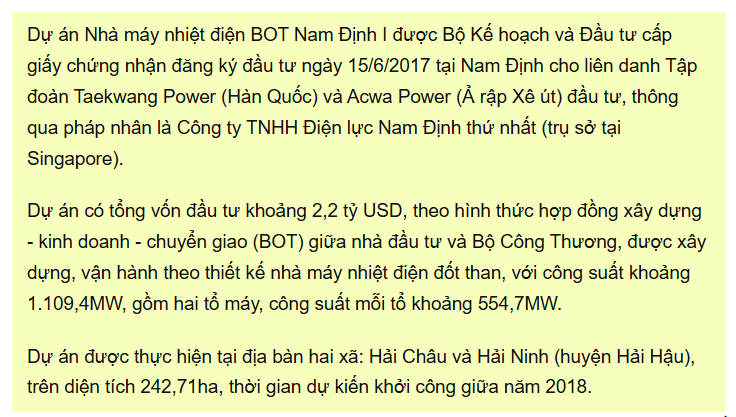 Trước đó, vào tháng 7/2024, Taekwang Group đề nghị ký bộ hợp đồng dự án BOT Nhà máy nhiệt điện Nam Định 1. Thế nhưng, theo Cục Điện lực, cơ sở này của Taekwang Group là chưa có cơ sở.
