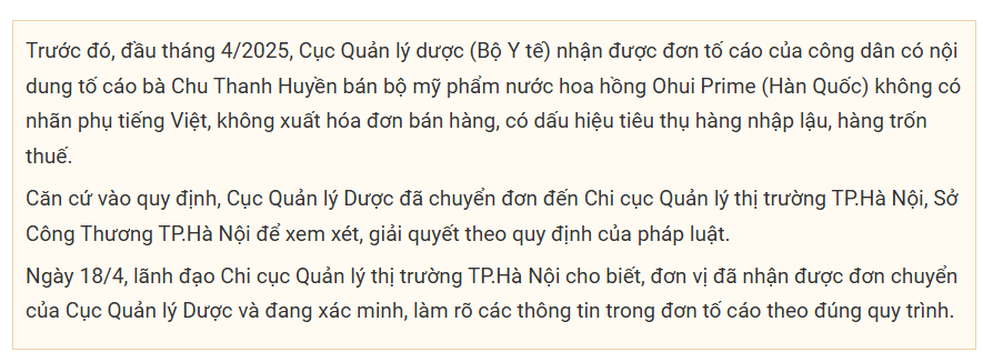 Chiều 8/10, tại buổi họp báo thường kỳ quý III của Bộ Công Thương, trả lời câu hỏi của báo chí về tiến độ, kết quả xử lý đơn tố cáo bà Chu Thanh Huyền bán hàng không có hóa đơn chứng từ, có dấu hiệu trốn thuế, ông Bùi Nguyễn Anh Tuấn - Phó Vụ trưởng Vụ Thị trường trong nước (Bộ Công Thương) cho biết nội dung đơn tố cáo này cơ bản là trường hợp người tiêu dùng mua mỹ phẩm trên môi trường online.