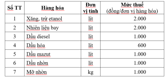 Cụ thể, mức thuế bảo vệ môi trường với xăng, trừ etanol là 4.000 đồng/lít; nhiên liệu bay là 3.000 đồng/lít; dầu diesel là 2.000 đồng/lít; dầu hỏa là 1.000 đồng/lít; dầu mazut là 2.000 đồng/lít; dầu nhờn là 2.000 đồng/lít; mỡ nhờn là 2.000 đồng/kg.