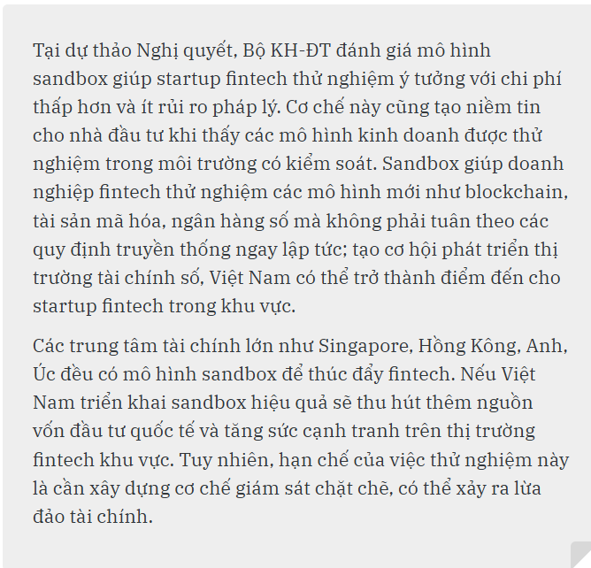 Tại dự thảo Nghị quyết, Bộ KH-ĐT đánh giá, việc triển khai chính sách sandbox sẽ tạo ra môi trường phát triển an toàn cho fintech tại Việt Nam, cân bằng giữa đổi mới sáng tạo và kiểm soát rủi ro, giúp xây dựng một trung tâm tài chính hiện đại, cạnh tranh, bền vững.