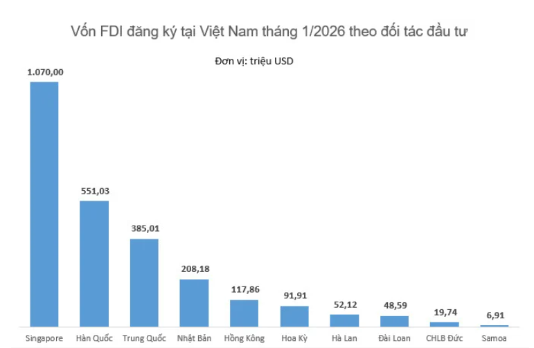 Về đối tác đầu tư, Singapore dẫn đầu về tổng vốn đăng ký trong tháng 01 với 1,07 tỷ USD, tiếp theo là Hàn Quốc, Trung Quốc và Nhật Bản.