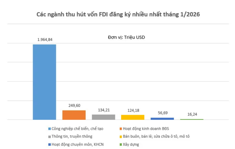 Xét theo cơ cấu ngành, vốn đầu tư nước ngoài đăng ký trong tháng 1 tiếp tục tập trung chủ yếu vào lĩnh vực công nghiệp chế biến, chế tạo, chiếm tỷ trọng áp đảo (76,3%) trong tổng vốn đăng ký.