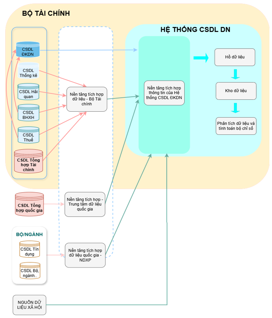 Tại Quyết định số 100/QĐ-BTC do Bộ Tài chính ban hành mô hình Kiến trúc Cơ sở dữ liệu doanh nghiệp, mục tiêu là hình thành cơ sở dữ liệu doanh nghiệp tập trung, thống nhất trên nền tảng Cơ sở dữ liệu quốc gia về đăng ký doanh nghiệp, kết hợp tích hợp và chia sẻ dữ liệu từ 5 nguồn dữ liệu khác. Lộ trình triển khai được chia thành 3 giai đoạn đến năm 2030.