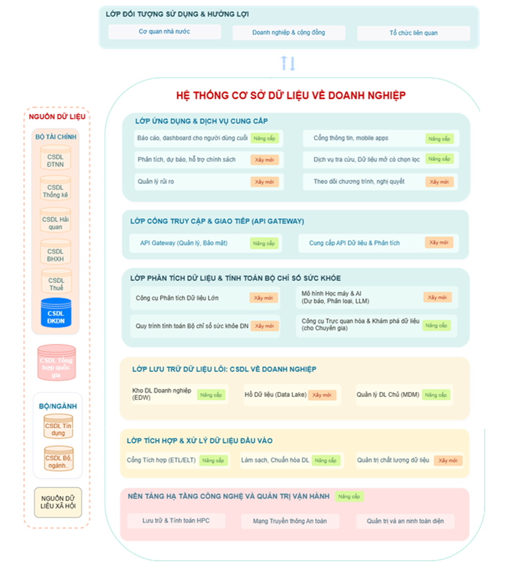 Mô hình kiến trúc tổng thể 8 lớp bao gồm: (1) nền tảng hạ tầng công nghệ và quản trị vận hành; (2) nguồn dữ liệu; (3) tích hợp và xử lý dữ liệu đầu vào; (4) lưu trữ dữ liệu lõi; (5) phân tích dữ liệu và tính toán bộ chỉ số sức khỏe doanh nghiệp; (6) cổng truy cập và giao tiếp (API Gateway); (7) ứng dụng và dịch vụ cung cấp; (8) đối tượng sử dụng và hưởng lợi. Xuyên suốt các lớp của hệ thống là lớp an toàn thông tin để đảm bảo tất cả các dữ liệu được bảo mật.