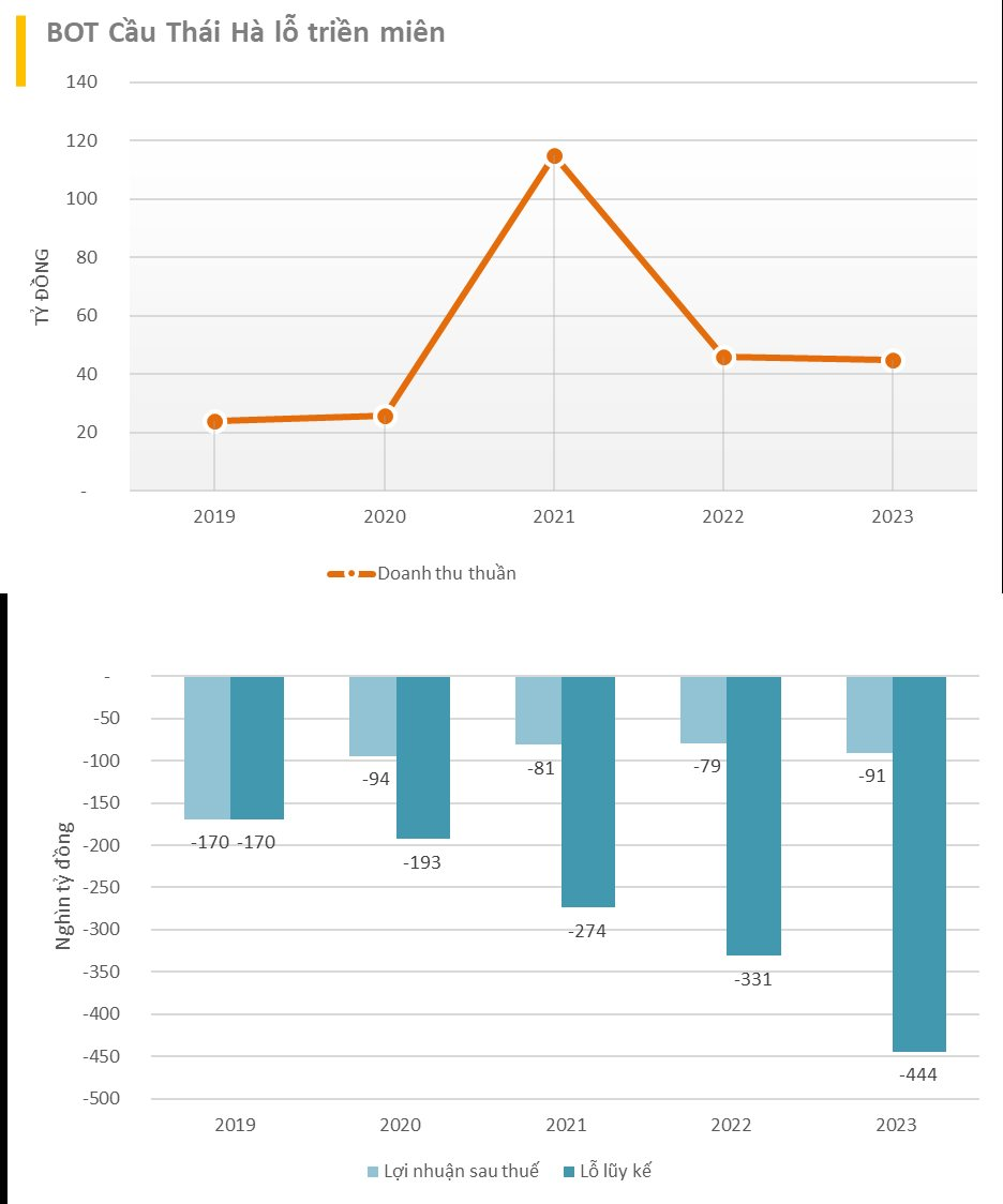 Tại thời điểm 31/12/2023, BOT Cầu Thái Hà đã lỗ lũy kế tổng cộng 444 tỷ đồng. Vốn điều lệ của công ty này ở mức 592,5 tỷ đồng khiến vốn chủ sở hữu chỉ còn 148,5 tỷ đồng.