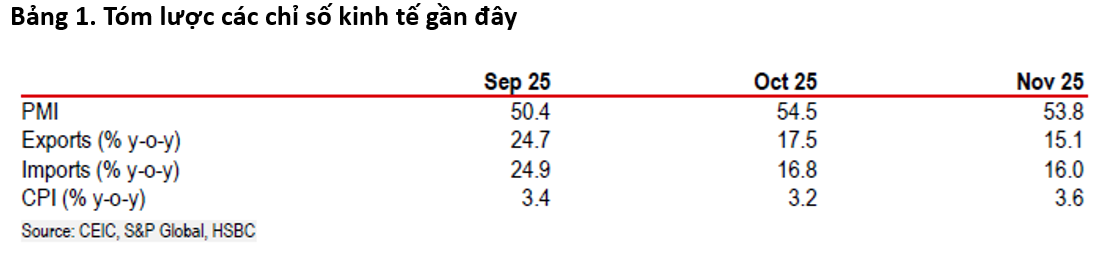 Mặc dù khó có thể dự đoán diễn biến của năm 2026 nhưng các chỉ số chính như PMI mang lại một số tín hiệu khả quan. Chỉ số PMI chính vẫn ở mức mở rộng 53,8 trong tháng 11, trong đó, một số chỉ số phụ cũng vượt qua mốc 50.