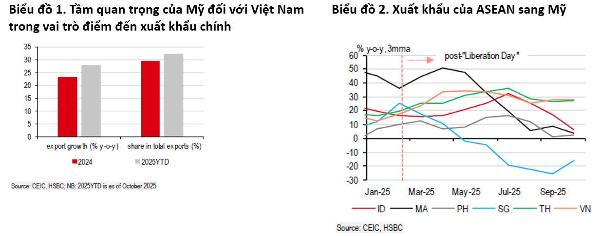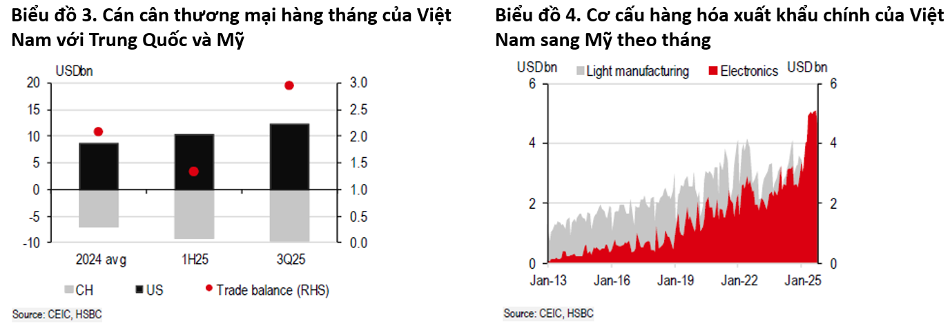 Việt Nam phụ thuộc nhiều vào thị trường Mỹ không chỉ trong lĩnh vực xuất khẩu mà còn ở cán cân thương mại. Sau khi thặng dư thương mại hàng tháng giảm gần một nửa xuống còn 1,3 tỷ USD trong nửa đầu năm 2025 so với năm 2024, con số này đã tăng lên 3 tỷ USD trong quý III/2025. Phần lớn sự bùng nổ thương mại với Mỹ đến từ lượng hàng điện tử xuất khẩu được duy trì ổn định ở mức cao.