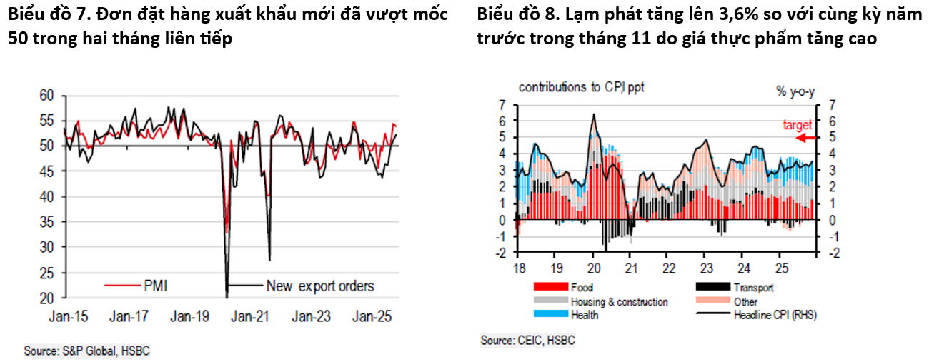 Tháng 11 tiếp tục ghi nhận tình hình thương mại tích cực, dù tăng trưởng với tốc độ chậm hơn, phản ánh tác động ngày càng giảm dần của hoạt động đẩy nhanh đơn hàng đặt trước (frontloading). Tăng trưởng xuất khẩu và nhập khẩu tháng 11 giảm xuống còn lần lượt 15,1% và 16% so với cùng kỳ năm trước, từ mức đỉnh. Sự chững lại của đà tăng trưởng thương mại diễn ra trên diện rộng nhưng xuất khẩu điện tử vẫn duy trì tốc độ tăng trưởng mạnh mẽ. Tăng trưởng xuất khẩu linh kiện máy tính và điện tử vẫn ở mức 62% so với cùng kỳ năm trước tính theo trung bình động 3 tháng.