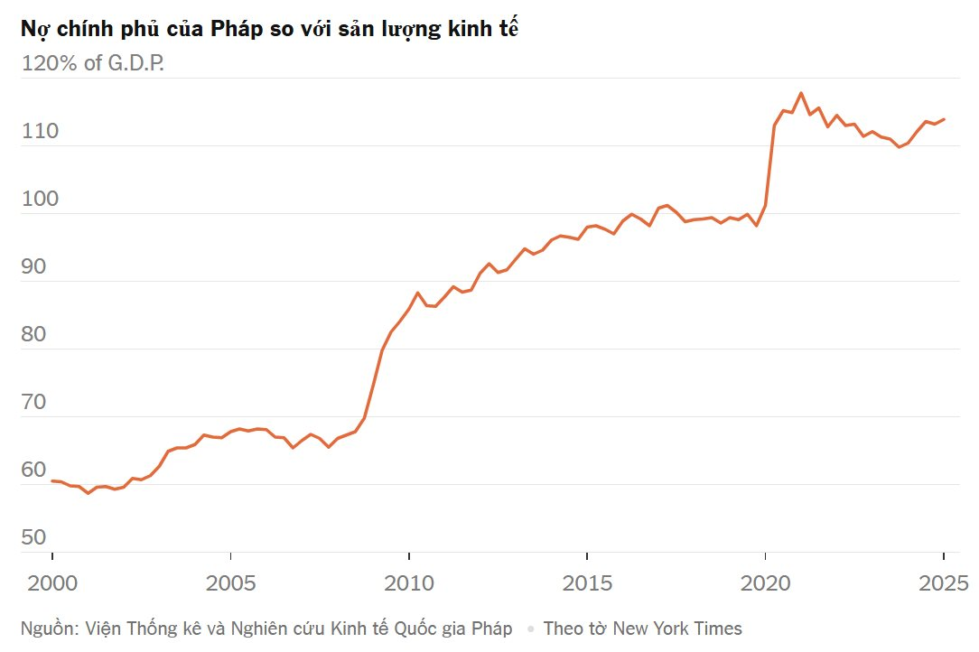 Về nợ công, theo Văn phòng Thống kê Pháp (INSEE), tính đến cuối quý 1/2025, Pháp đã nợ tới 3.345 nghìn tỷ euro, tương đương 116% GDP. Con số này tăng đáng kể so với mức chỉ chiếm 60% GDP đầu thập niên 2000. Oxford Economics dự báo nợ công của Pháp có thể vượt ngưỡng 120% GDP vào cuối năm 2027.