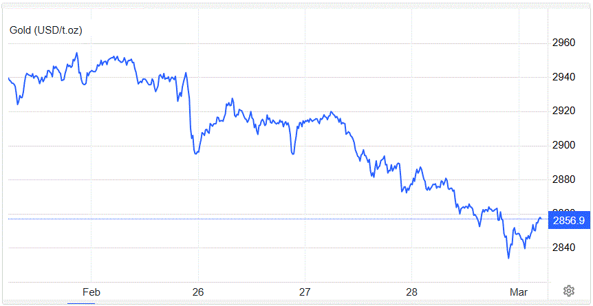 "Vàng đã lập kỷ lục vào ngày 24/2, ở mức gần 2956 USD. Hoạt động chốt lời đã diễn ra trong những ngày gần đây". “Thật trớ trêu, kim loại quý màu này đã hoạt động giống một tài sản rủi ro hơn là một nơi trú ẩn”. “Mức hỗ trợ ban đầu hiện có thể là gần 2814 USD và nếu phá vỡ có thể xuống 2770 USD”. “Các chỉ báo động lượng đang giảm. Các nhà giao dịch có thể đang thận trọng dò “đáy” cho đến khi có một số dấu hiệu kỹ thuật cho thấy giáo đảo ngược tăng trở lại”.