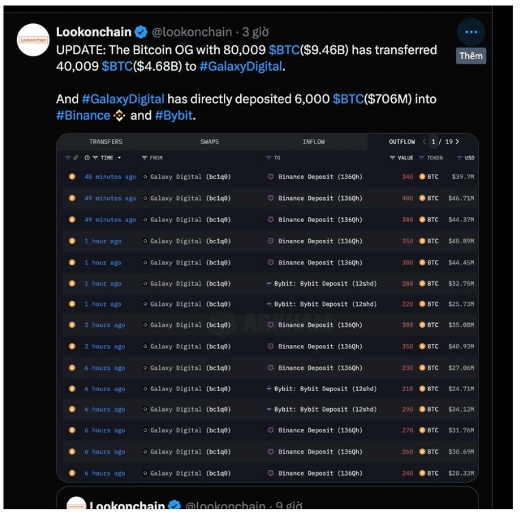 Theo dữ liệu được ghi nhận bởi công ty nghiên cứu LockonChain, tài khoản nói trên chuyển một nửa tài sản cho Galaxy Digital. Đây là tổ chức chuyên hỗ trợ việc giao dịch tiền số với số lượng lớn. Sau đó, Galaxy Digital chuyển hơn 9.000 BTC lên Binance và Bybit để bán.