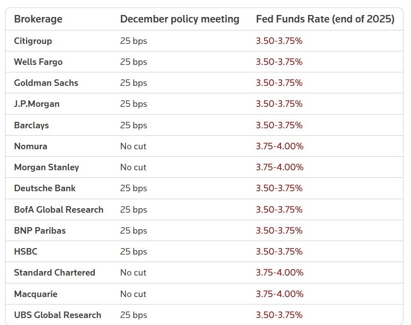Dự báo của các công ty môi giới toàn cầu về cuộc họp tháng 12 của Fed