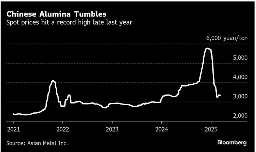 Sau khi tăng gần gấp đôi vào năm 2024 lên mức cao kỷ lục là 5.770 nhân dân tệ (795 USD) một tấn, giá alumina đã giảm mạnh khi công suất mới được đưa vào hoạt động.