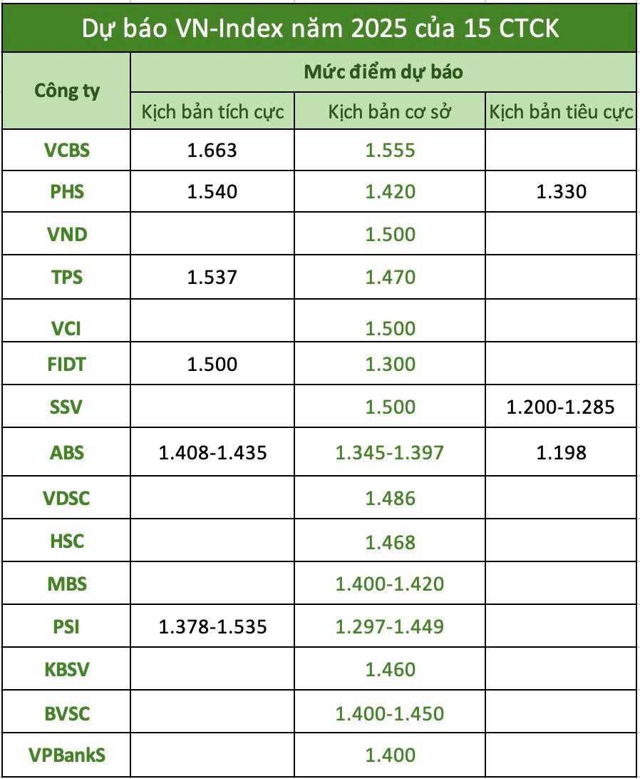 Cũng đưa ra kịch bản cho năm 2025, Chứng khoán PHS lạc quan nhận định thị trường chứng khoán Việt Nam (TTCK) sẽ khởi sắc mạnh mẽ với ba kịch bản cụ thể. Ở kịch bản cơ sở, VN-Index sẽ đạt 1.330 điểm với tăng trưởng thu nhập 10% và GDP tăng 6%. Trong kịch bản lạc quan hơn, chỉ số có thể đạt 1.420 điểm nếu tăng trưởng thu nhập đạt 18% và GDP tăng 7%. Với kịch bản tốt nhất, CTCK này dự báo VN-Index có thể sẽ chạm mốc 1.540 điểm với tăng trưởng thu nhập 25% và GDP tăng 7,5%.