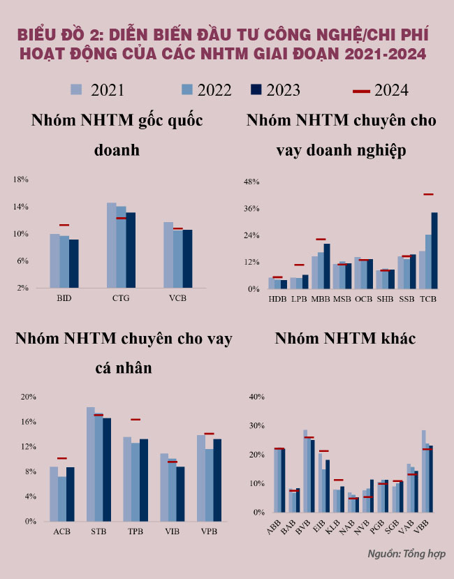 Mặc dù đều hướng đến mục tiêu số hóa, nhưng các nhóm ngân hàng lại có chiến lược đầu tư rất khác nhau tùy theo đặc điểm hoạt động và nhóm khách hàng mục tiêu. Dẫn đầu là nhóm ngân hàng thương mại cổ phần chuyên cho vay doanh nghiệp, với mức đầu tư cho công nghệ lên đến 13.743 tỉ đồng trong năm 2024, chiếm 19,89% chi phí hoạt động.