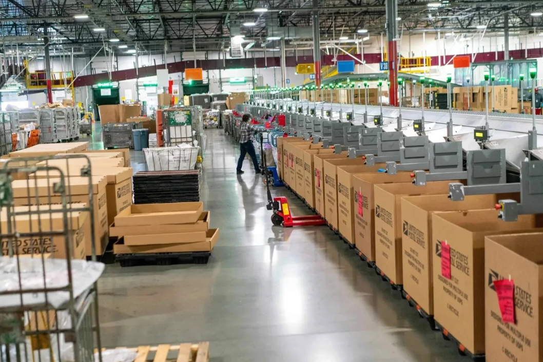 Bên trong Trung tâm xử lý và phân phối đơn hàng của Dịch vụ Bưu điện Mỹ (USPS) tại Los Angeles. Ảnh: Bloomberg.