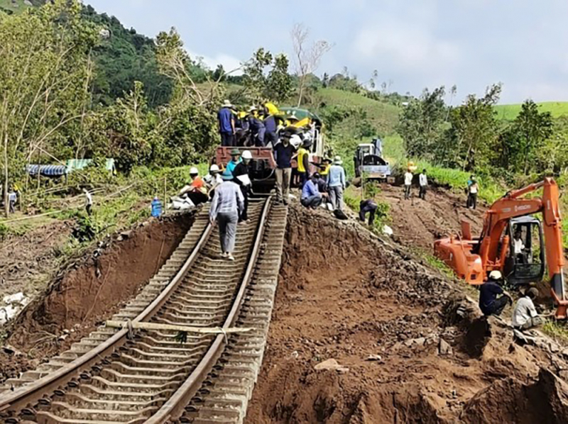 Nhân viên đường sắt đang nỗ lực khắc phục tuyến đường bị sạt lở do mưa lũ gây ra.