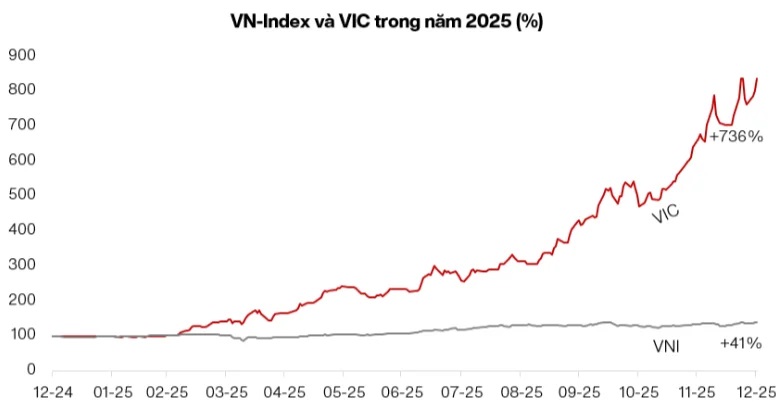 Mặc dù bức tranh tổng thể của VN-Index mang màu sắc tích cực, diễn biến thị trường trong năm 2025 cho thấy một thực tế quan trọng: đà tăng của chỉ số chủ yếu được dẫn dắt bởi một số ít cổ phiếu vốn hóa lớn. Nếu loại bỏ các cổ phiếu này, chỉ số chỉ tăng khoảng 14%, và định giá thị trường khi đó chỉ còn khoảng 11 lần P/E. Cổ phiếu Vingroup (VIC) tăng gần 740%, phần lớn do tỷ lệ cổ phiếu tự do chuyển nhượng và thanh khoản thấp. Đà tăng này đã đẩy tỷ trọng của VIC trong VN-Index lên khoảng 15%, trong khi tổng tỷ trọng các doanh nghiệp thuộc hệ sinh thái Vingroup chiếm gần 25% toàn chỉ số.