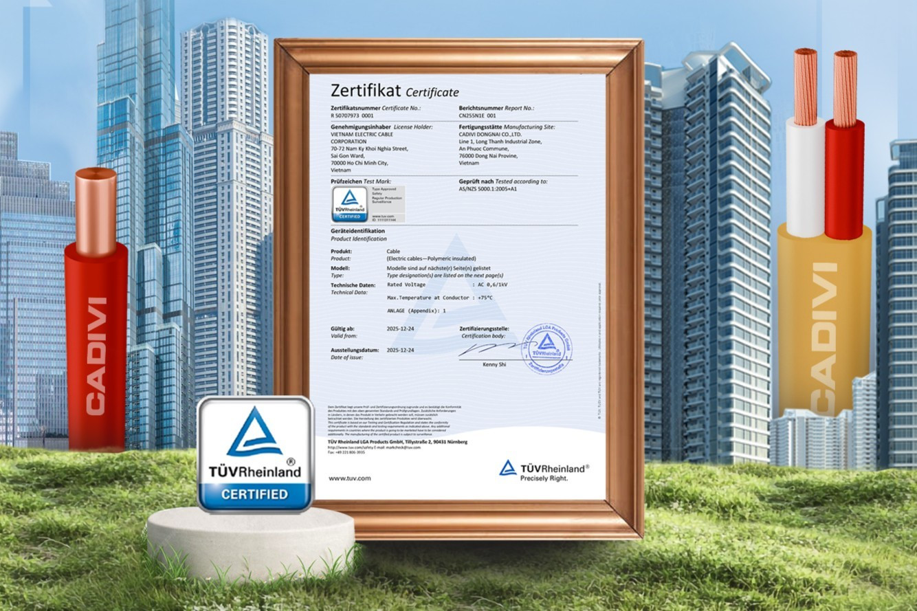 Năm 2026, Công ty Cổ phần Dây cáp điện Việt Nam (CADIVI) tiếp tục khẳng định vị thế dẫn đầu ngành dây cáp điện Việt Nam với việc dòng dây điện dân dụng không chì (LF) đạt chứng nhận TÜV Rheinland, đáp ứng tiêu chuẩn chất lượng quốc tế và chuẩn an toàn châu Âu.