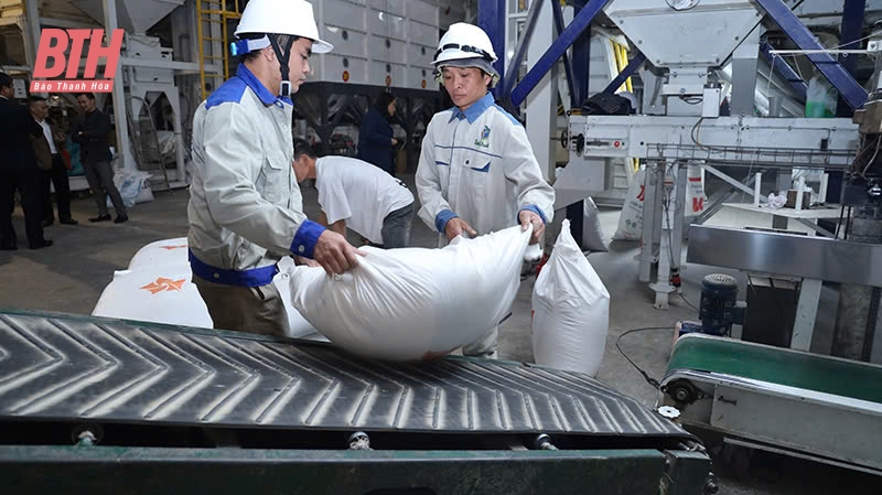 Công nhân Nhà máy sản xuất, chế biến lúa gạo Sao Khuê (TP Thanh Hóa) trong ca sản xuất.